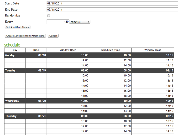 You will see the schedule now in the table at the end of the scheduling box. It shows you when each alert is scheduled for and when the window will open and close. Press Create schedule from parameters and you will see the assignment appear in the table on the My Surveys page. If you click the Edit